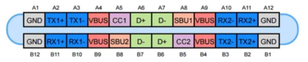 完整的 Type-C 接口共有 24 个针脚,A 面和 B 面镜像对称。根据功能可以简单分成四个部分:供电、数据传输、控制、辅助。
