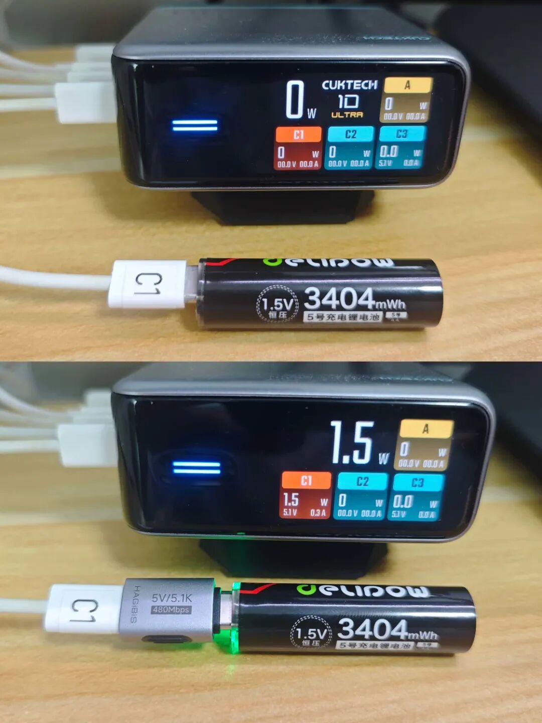 几天后我的「5.1K C to C 转接头」到家了。这个小东西通过补充识别电阻的方式,让充电器把连接的设备识别为受电端,从而进行供电。